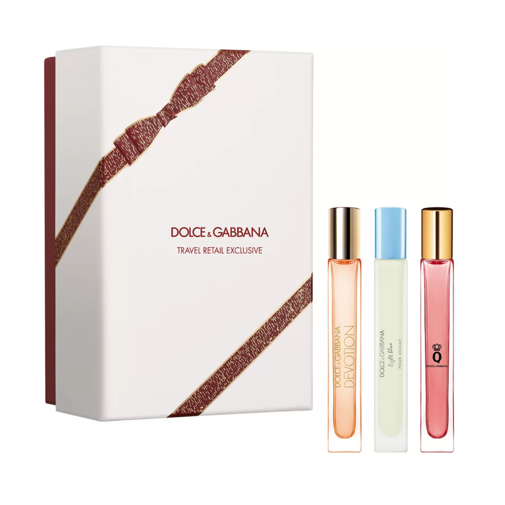 A set of three popular fragrances in travel sizes in an ivory box, "Divotion", which sublimates the purest emotions into a unique essence, "Light Blue", which expresses the rich days spent in the sun on Capri, and "Q by Dolce", which is inspired by passion, love, and energy & Gabbana".