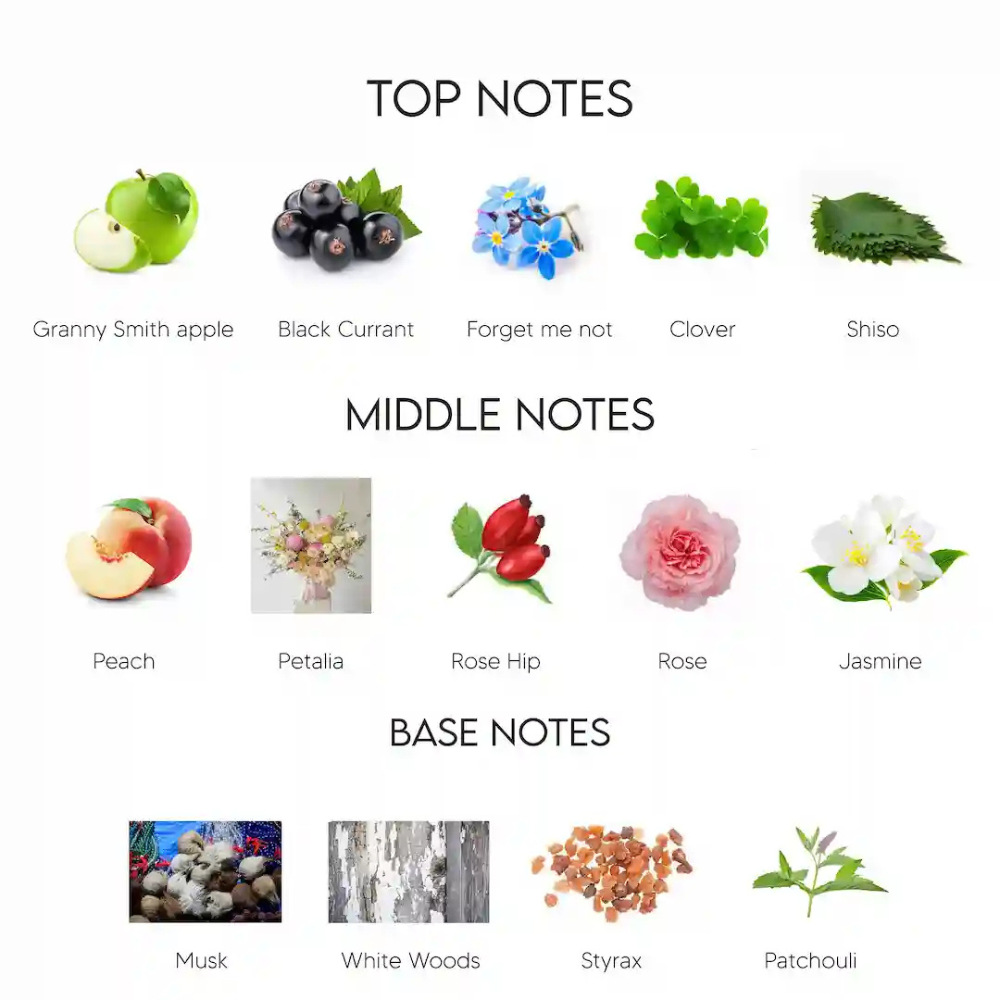 • Top Notes:Blackcurrant, Granny Smith Apple, Clover, Forget-me-not, Shisolia